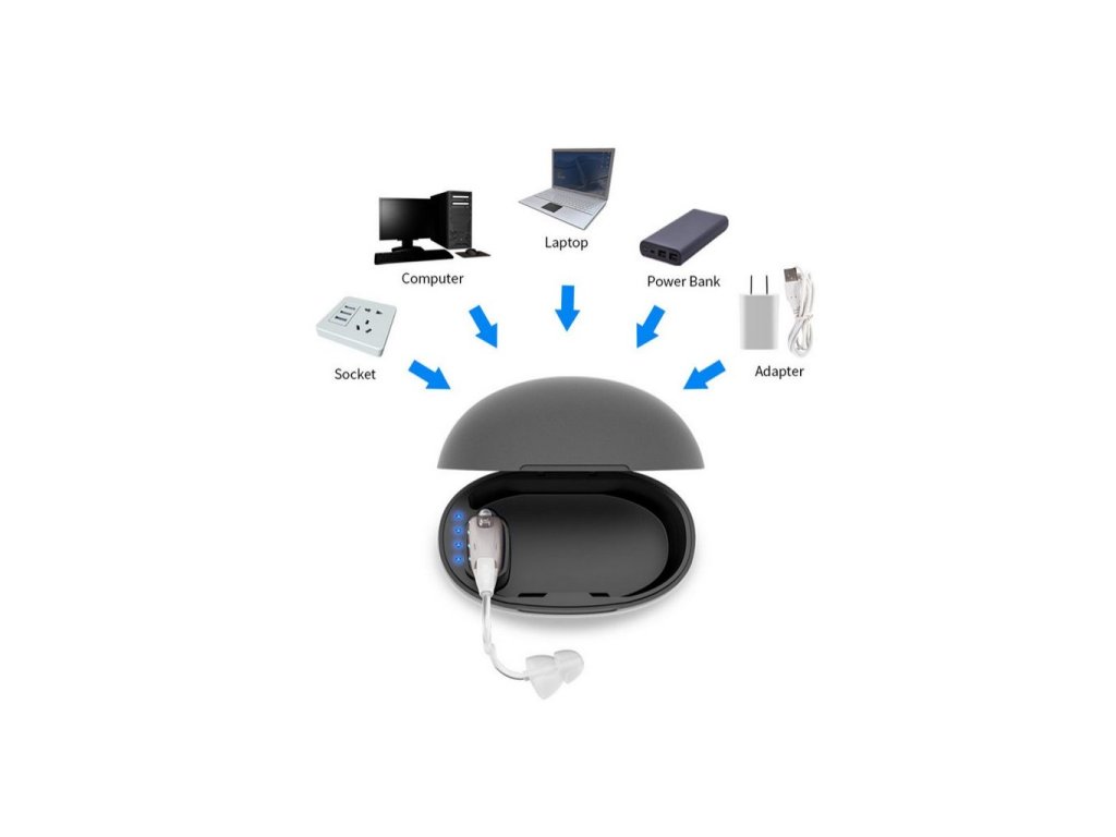 Dobíjení je pohodlné – naslouchátko stačí vložit do nabíjecí základny s USB připojením, která ukáže stav nabití pomocí LED indikátoru. Součástí balení jsou 3 různé velikosti měkkých silikonových ušních nástavců, aby si každý uživatel našel pohodlné a bezpečné uchycení.
